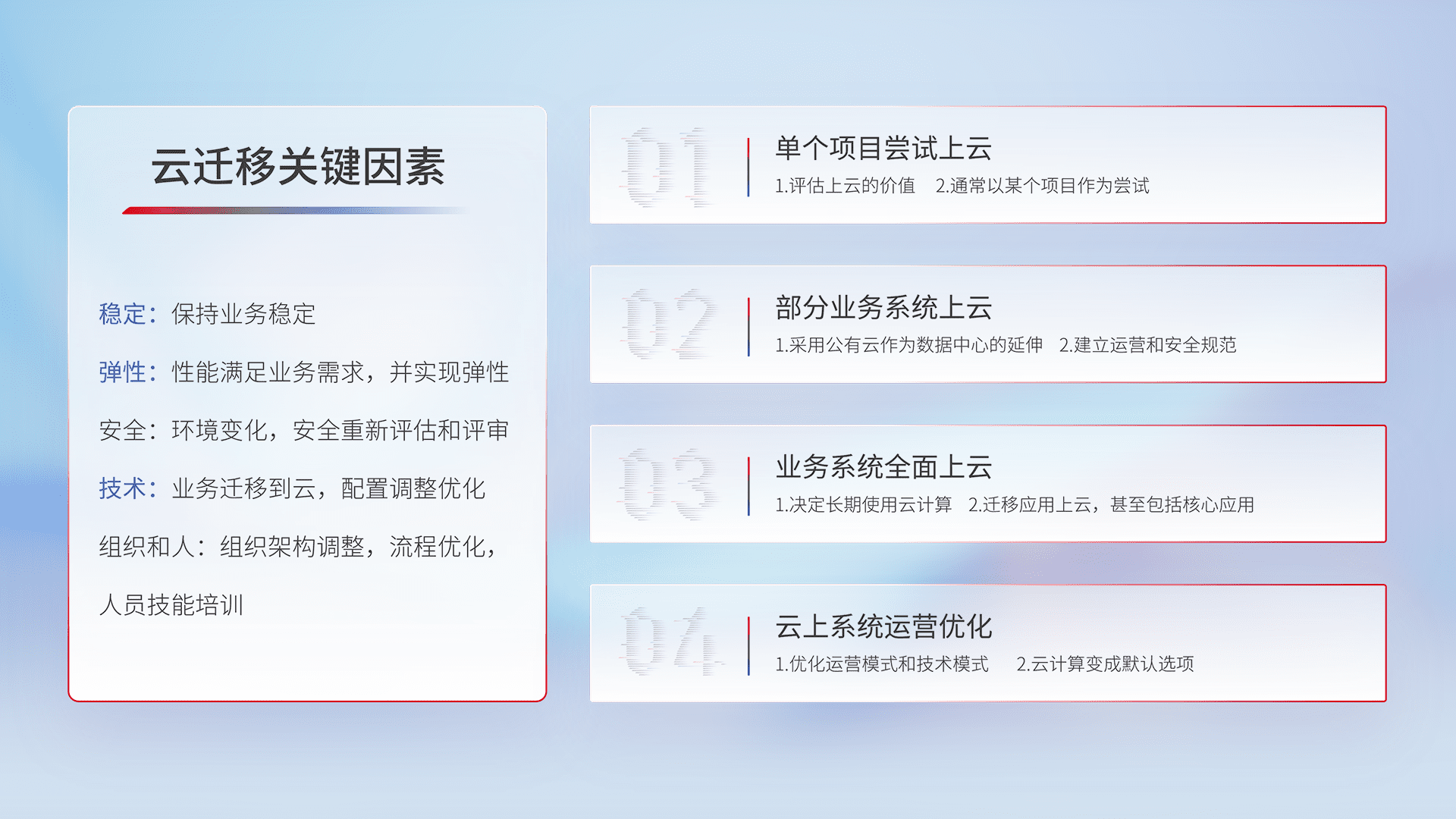 结合实际业务,,,从规划设计、、、、云平台选型、、云原生改造、、、、数据迁移、、、、集成交付,,迁移全过程为客户识别最佳上云路径,,做好风险识别管理,,,,设计网络架构、、身份权限、、、、安全审计合规、、、、操作审计、、日志审计、、、、监控告警策略、、多站点容灾设计等,,,,对云上基础设施进行整体规划,,,,提升IT治理水平,,,,以满足弹性、、、高可用、、、高性能的需求。。。。