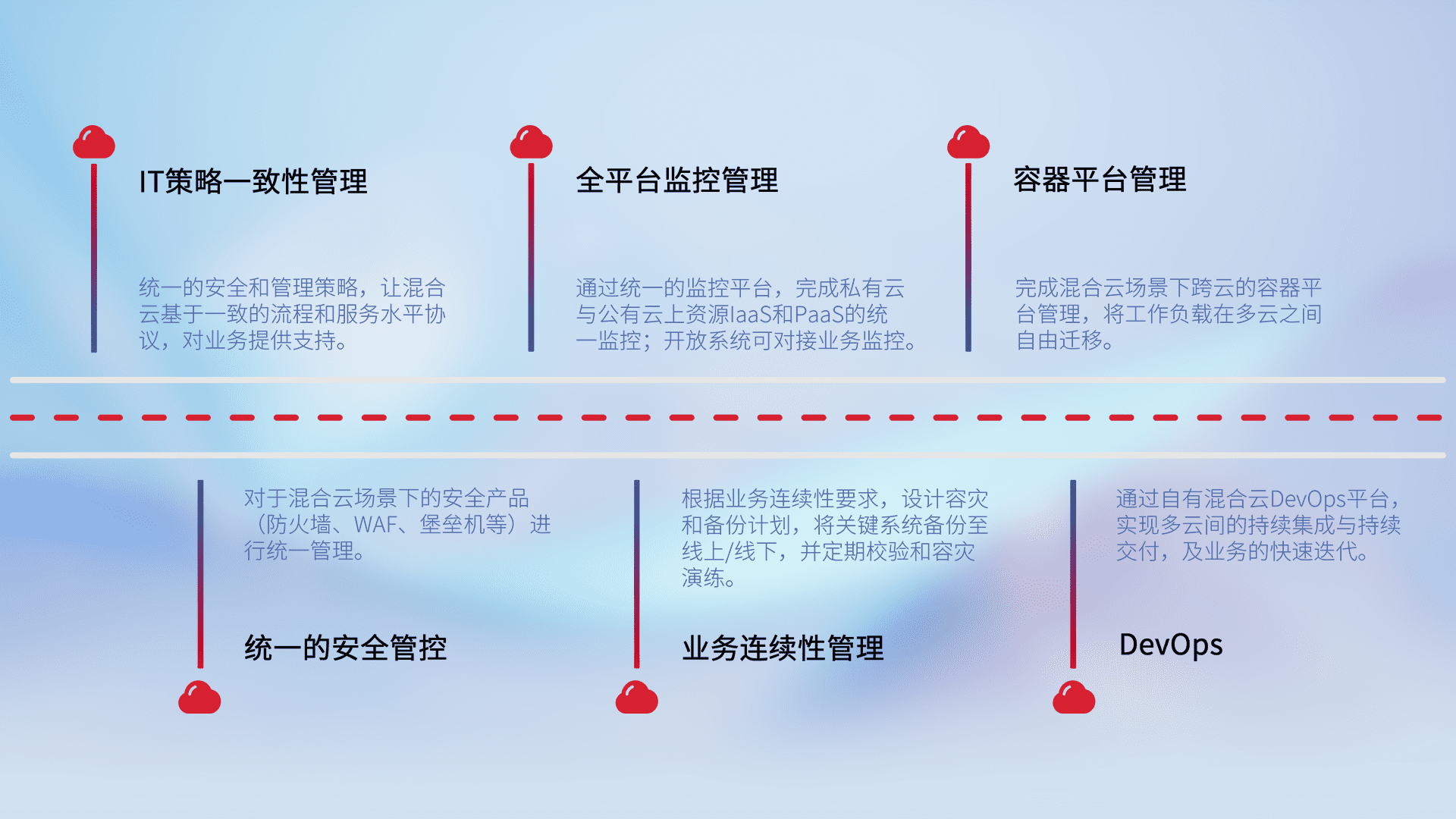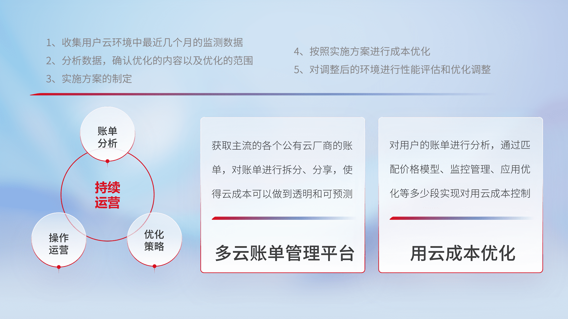 通过多云纳管,,,,以统一的资源数据模型把客户的云资源进行抽象和封装,,进而实现对多云资源的统一操作,,,保障云资源管理的可靠性、、、稳定性与可用性。。量身定制化运维内容,,,,配置、、开发运维、、、补丁管理、、、、备份、、、监控、、认证和访问管理、、、审计和日常巡检等,,,,保障在用云过程中的可靠度,,,,稳定度以及高可用率。。。