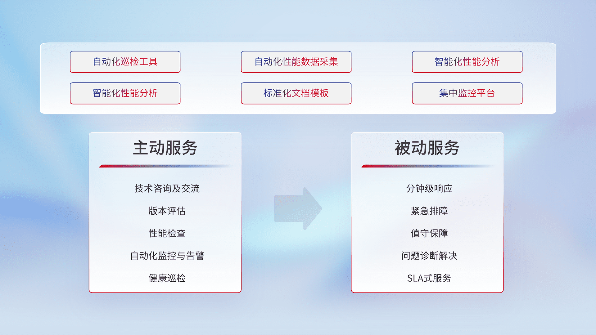 智能化工具和标准化文档,,保障服务质量,,提供主动服务(包含技术咨询、、、版本评估、、、性能检查、、、自动化监控与告警、、、、健康巡检)和被动服务包含(分钟级响应、、、紧急排障、、、、值守保障、、、、问题诊断解决、、、、SLA服务)。。。。